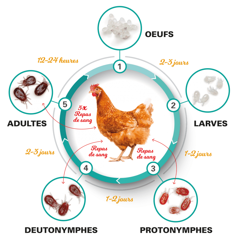 Le pou rouge est un acarien qui se nourrit du sang de votre poule. Son fonctionnement est similaire à celui de la punaise de lit chez l’humain.